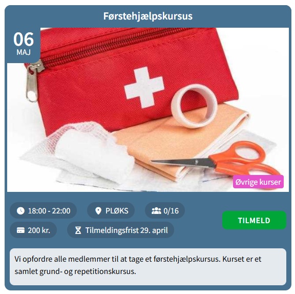 Vi opfordre alle medlemmer til at tage et førstehjælpskursus, eller vedligeholde det de har (hvert andet år), og kan derfor tilbyde dette kursus til kun 200,- kr. for medlemmer.