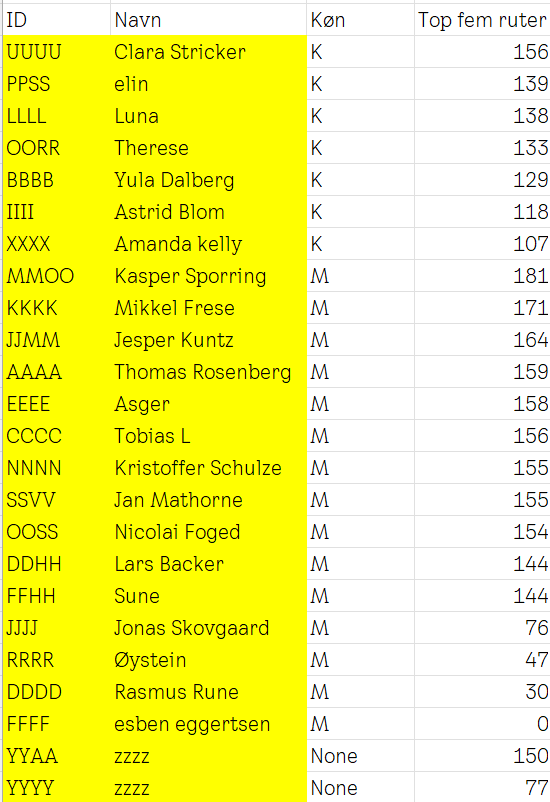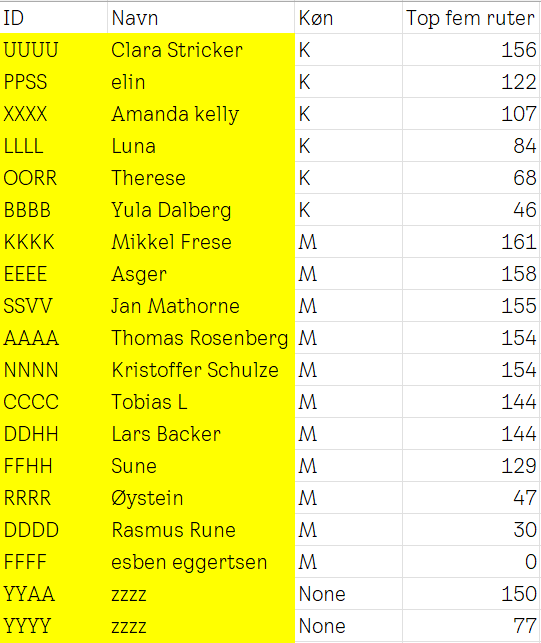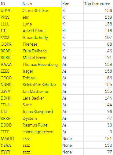 | ID | Navn | Køn | Top fem ruter |
