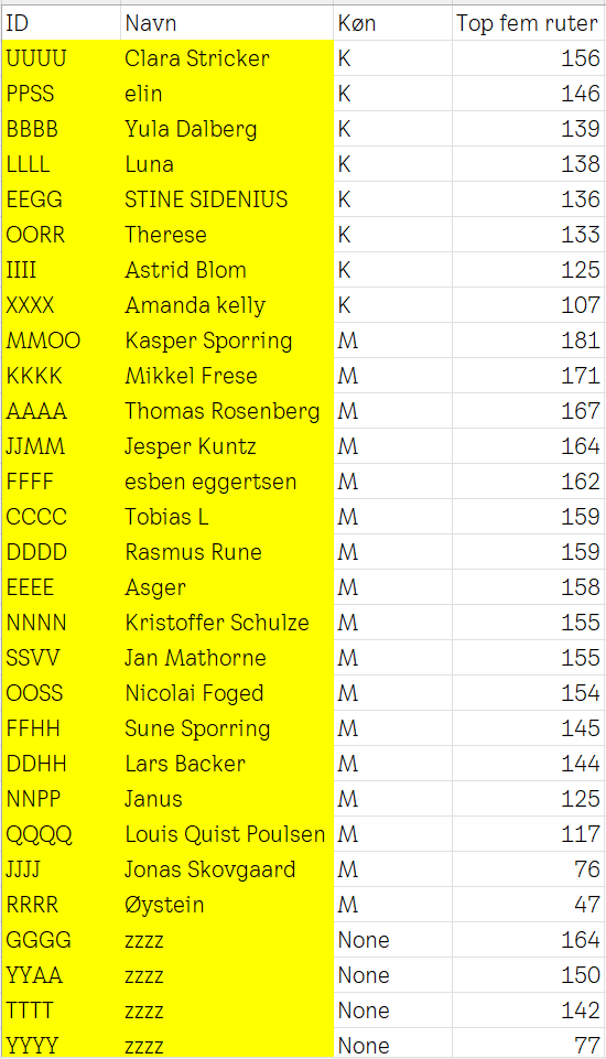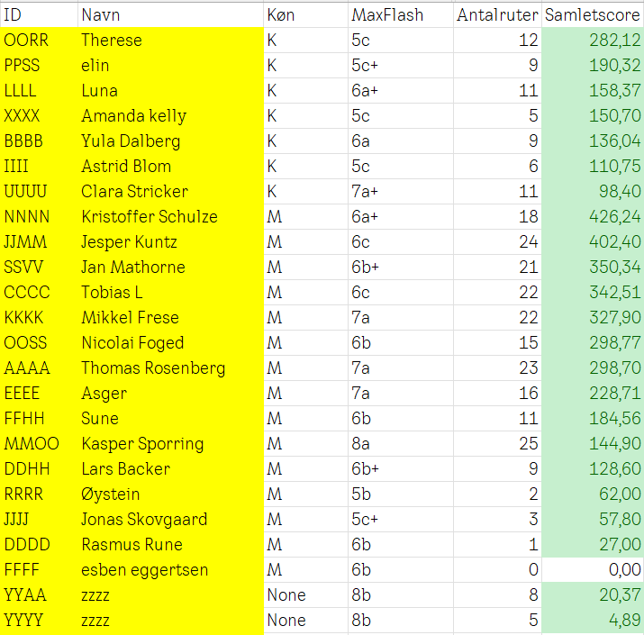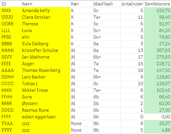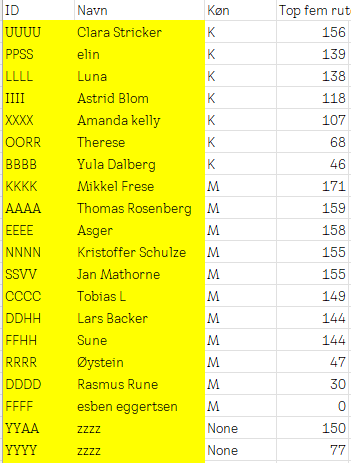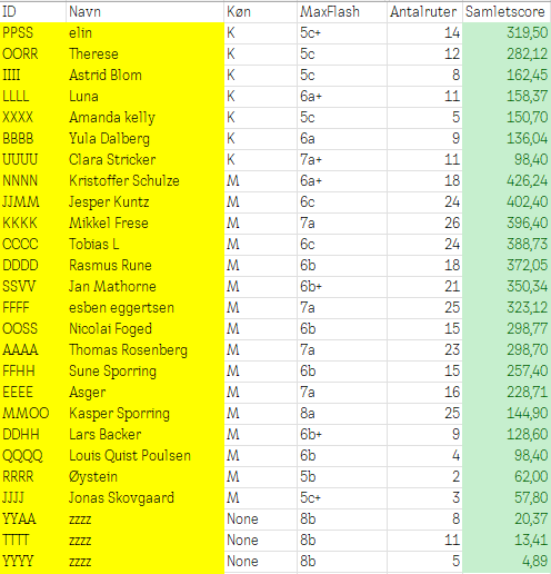 | ID | Navn | Køn | MaxFlash | Antalruter | Samletscore |